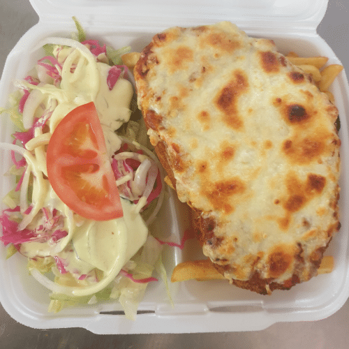 Alle Gerichte werden mit Pommes frites und Beilagensalat serviert.
